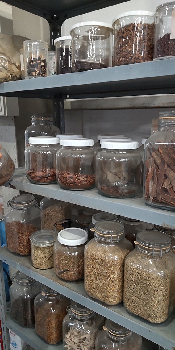 棚にずらりと並んだ、草木染めの原料となる草木。