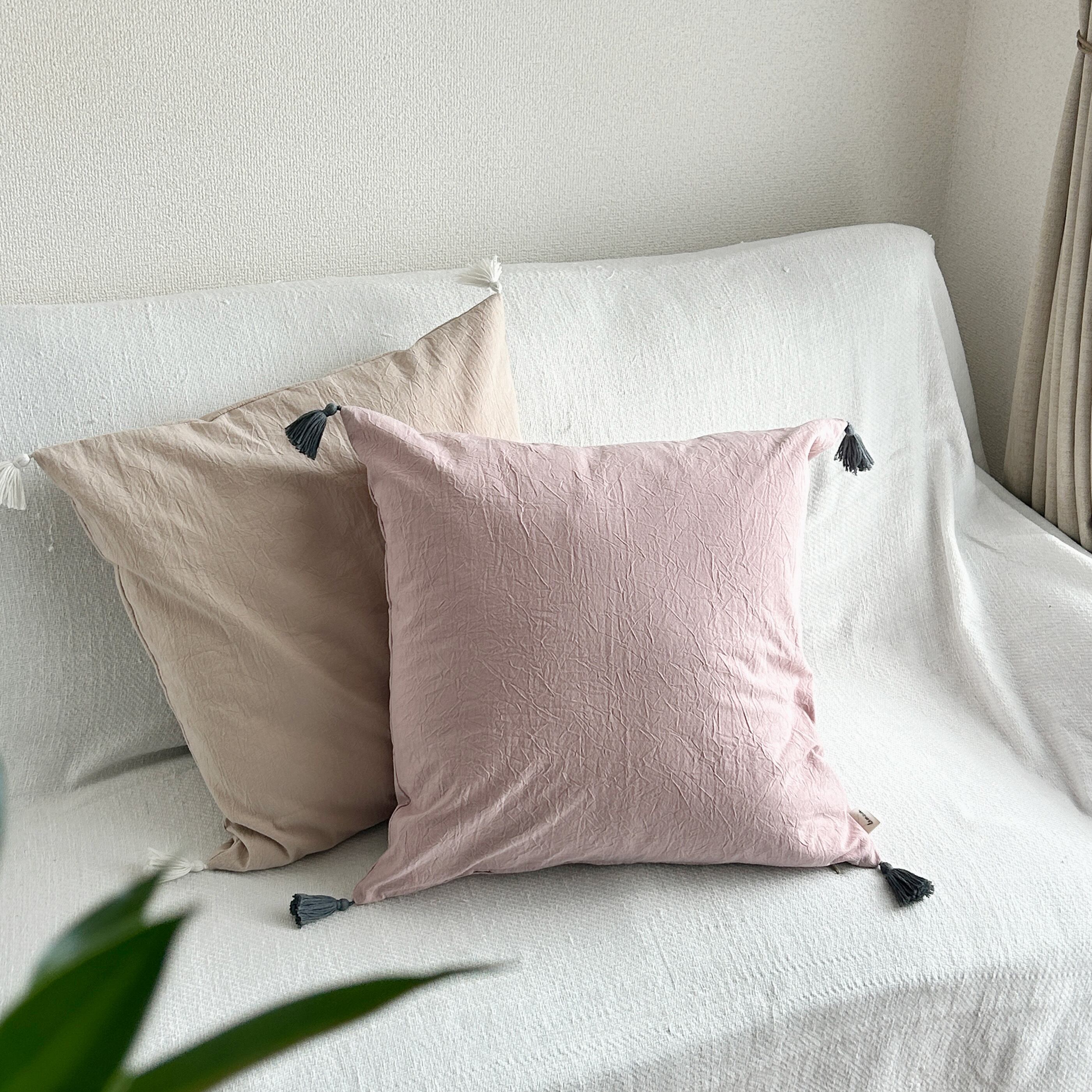 ワッシャー加工(洗いっぱなしのようなしわ加工)を施したコットン生地に、タッセルがワンポイントのクッションカバーが仕上がりました。